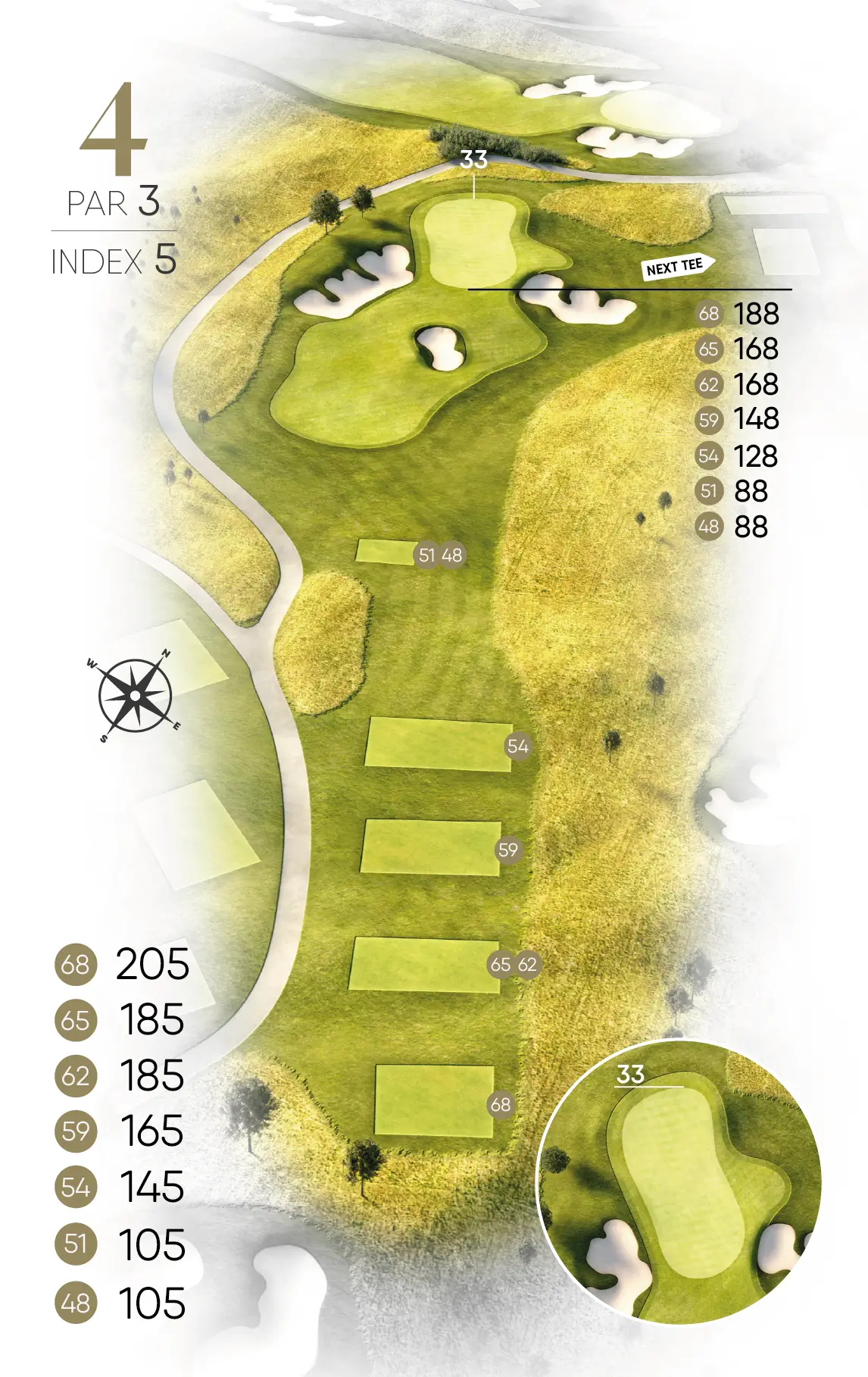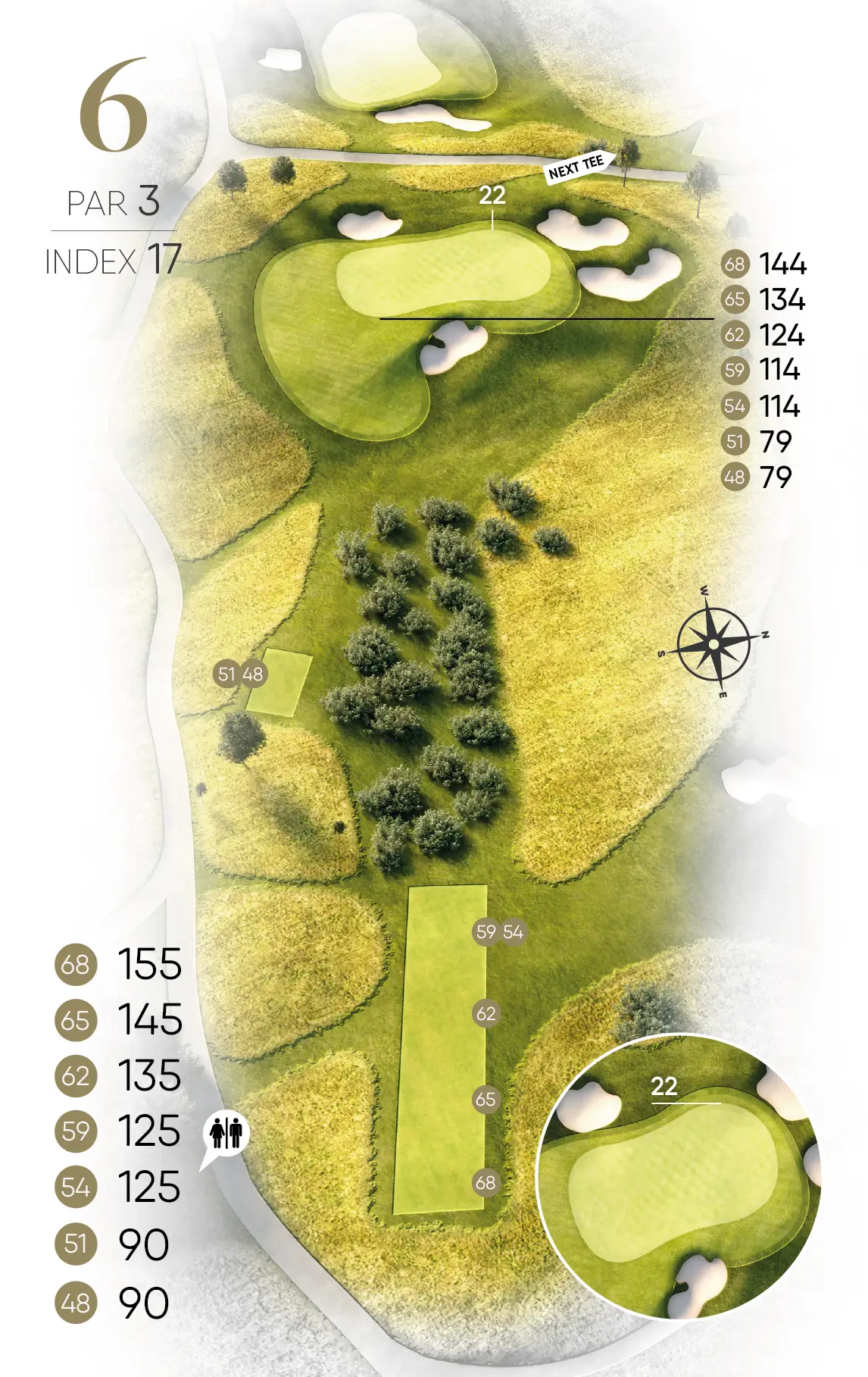 Det finns sju olika tees att välja mellan och tee 59, där banlängden är strax under 6000 meter, upplevs tillräcklig för de flesta. Man kan faktiskt med fördel och glädje välja att spela banan kortare. Det är lättare att känna sig duktig då. Den omgärdande bokskogen med sin berömda skira grönska om våren och med en färgsprakande palett i gult, brunt och rött när hösten kommer. Djurlivet är ständigt närvarande för den som har ögonen öppna. Såväl rådjur som dovhjort kan ge upplevelsen ytterligare dimensioner. Och ibland önskar man att gladan som mestadels svävar över banan kunde hjälpa till att hitta bollen i ruffen.